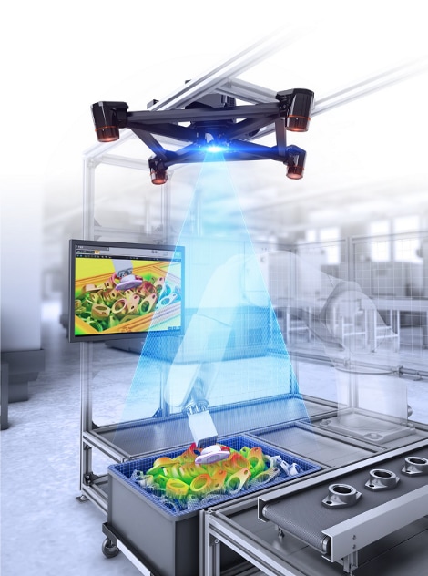 Cette technologie de dévracage 3D localise dans les bacs les pièces en vrac afin de guider un robot pour la préhension de la pièce grâce à l'acquisition d’images 3D.