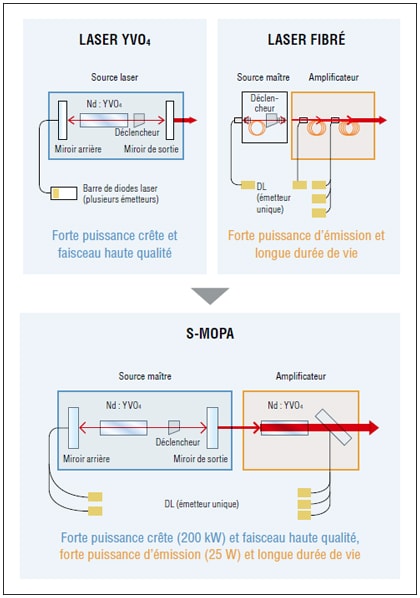 Le faisceau de haute qualité des sources laser YVO4 est associé à la technologie d’amplification utilisée par les lasers fibré qui permet une forte puissance d’émission du laser. Une longue durée de vie est garantie grâce à l’utilisation d’un unique émetteur composé d’une diode laser (DL) à haute dissipation de la chaleur.