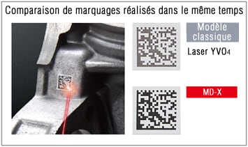 La série MD-X1500 offre une puissance d’émission de 25 W environ équivalente à 2 fois celle des lasers YVO4 classiques. Cette puissance d’émission permet un marquage et un traitement plus rapides, contribuant ainsi à une amélioration de la productivité. En outre, la série MD-X1500 peut être utilisée en mode continu (onde entretenue) ou pulsée en fonction de l’application. Une forte puissance d’émission est idéale en cas de nécessité de réaliser des marquages de haute qualité à grande vitesse, tels que des marquages de codes 2D sur des surfaces métalliques.