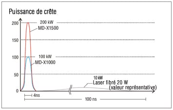 La série MD-X1500 offre une puissance crête de 200 kW environ équivalent à 2 fois celle des lasers YVO4 classiques. Malgré une forte puissance d’émission du laser, la série MD-X1500 permet de minimiser les dommages causés à la cible par la chaleur grâce à une largeur d’impulsion de seulement 4 ns. La série MD-X1500 se révèle ainsi être le marqueur laser idéal pour toute application où les effets de la chaleur doivent être réduits au minimum, notamment le marquage par coloration sur une pièce en résine.