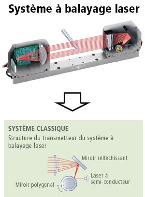 Un laser à semi-conducteur émet un faisceau vers un miroir polygonal rotatif et balaye ainsi la plage de mesure. Les valeurs de mesure sont calculées à partir de l'amplitude d'obstruction du faisceau par la cible.