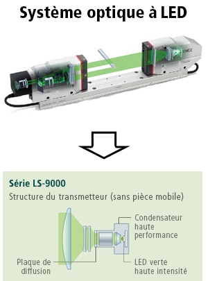 La lumière de la LED verte est émise sous la forme d'un faisceau parallèle uniforme. Le capteur CMOS détecte la position des bords, limites entre les zones lumineuses et sombres, grâce à la lumière reçue et calcule les valeurs de mesure.