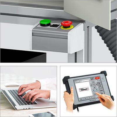 Les boutons fréquemment utilisés, comme le bouton de démarrage du marquage, sont installés. Il est également possible de fixer une table pour PC ou un écran tactile.