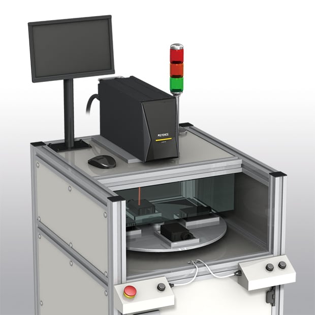 Les systèmes d'indexation comportent un dispositif de positionnement qui déplace les cibles sur un plateau tournant dans la position de marquage. Avec ce type de système, le marquage peut être effectué au fond pendant que d'autres cibles sont placées à l'avant, ce qui offre des temps de cycle plus courts qu'avec les systèmes autonomes.