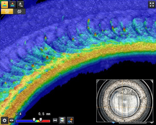L'alignement du profil permet de créer une image 3D optimale. On peut ainsi réaliser des inspections en ligne stables pour les bosses, copeaux et autres défauts.