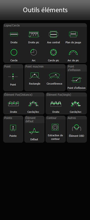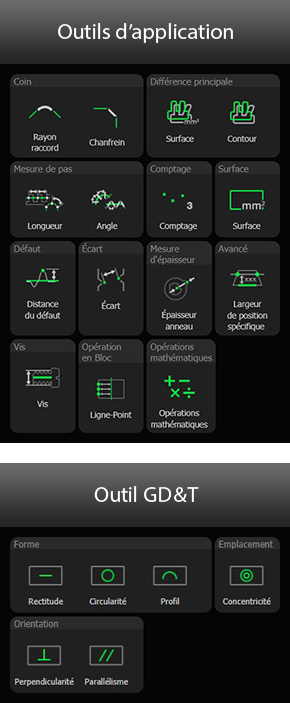 Exploitez et associez plus de 100 outils pour réaliser une large palette de contrôles sur ligne de production, notamment des mesures dimensionnelles, des mesures de GD&T, des comparaisons à la référence ou encore une mesure de distance de défaut.