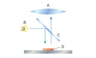A : Objectif, B : Source lumineuse, C : Miroir semi-réfléchissant, D : Objet