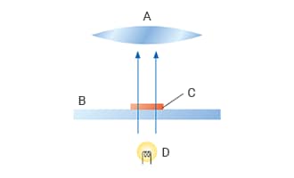 A : Objectif, B : Plaque de verre, C : Objet, D : Source lumineuse
