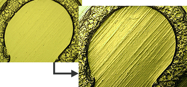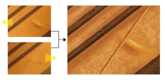 Lors de l'évaluation de la profondeur et de la finesse des caractéristiques de surface, plus les différences de hauteur sont faibles, plus le contraste diminue, ce qui rend l'observation et l'évaluation difficiles. Les microscopes conventionnels affichent des images différentes selon l'éclairage et l'angle, et sont sujets à l'éblouissement dû aux reflets et à un contraste plus faible. Cela rend les rainures peu profondes difficiles à observer, et elles peuvent ne pas être détectées. La fonction multi-éclairage du microscope numérique 4K Série VHX peut capturer automatiquement des données d'éclairage omnidirectionnel. En sélectionnant l'image la plus appropriée pour l'observation à partir de ces données, vous pouvez réduire considérablement le temps nécessaire à la configuration de l'éclairage.