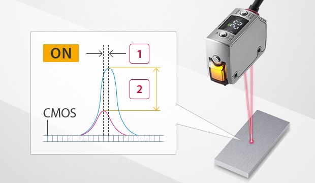 La distance à l’arrière-plan et la lumière reçue en l’absence de cible sont enregistrées en tant que référence sur le capteur. Lorsqu’une cible entre dans le champ de détection, le capteur la détecte à partir de la variation de la distance et de la lumière reçue par rapport à la référence enregistrée. La référence à l’arrière-plan permet d’assurer une détection stable de toute cible, même de forme complexe, dont la couleur ou l’état peut varier, ou encore d’une extrême finesse, avec une faible différence de hauteur.