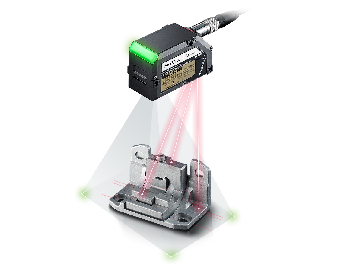 Les capteurs laser basés sur l'image de la Série IX peuvent mesurer la hauteur n'importe où dans la zone. La reconnaissance d'image par caméra permet au laser de détecter la hauteur d'une cible même lorsque les pièces ne sont pas parfaitement alignées sur la ligne de production. La hauteur de l'endroit où le laser frappe la cible varie si la cible est inclinée ou si la cible elle-même est différente, mais la Série IX peut identifier la différence de hauteur par rapport à la référence. Sur une ligne d'assemblage, un même capteur IX peut non seulement vérifier la présence de pièces, mais aussi effectuer des contrôles d'assise et d'autres inspections basées sur la hauteur. Grâce à sa capacité à détecter les différences de hauteur, la série IX est également exempte de fausses détections et d'erreurs en présence de reflets provenant de surfaces brillantes de pièces métalliques ou lorsque la cible de la détection a la même couleur que l'arrière-plan, offrant ainsi une différenciation automatique stable en ligne.