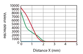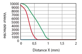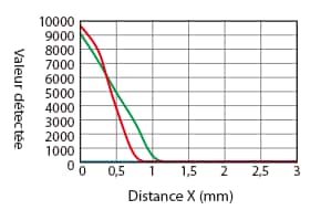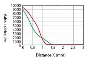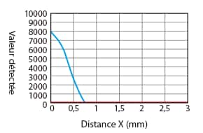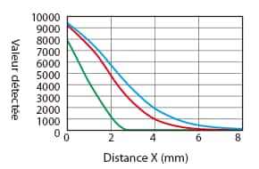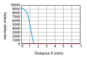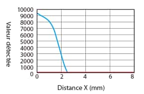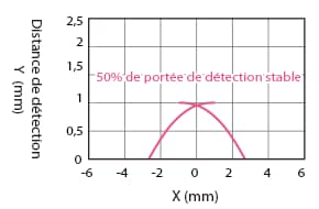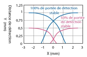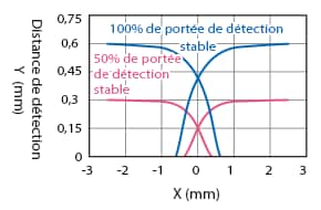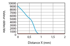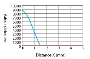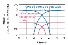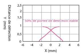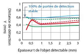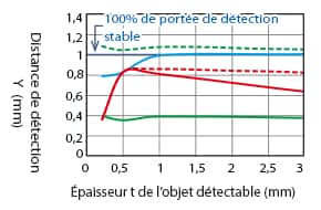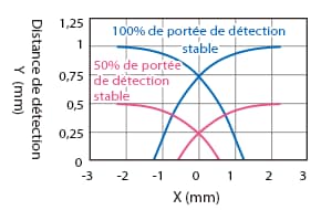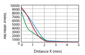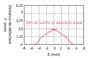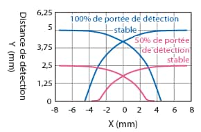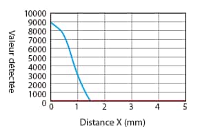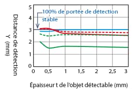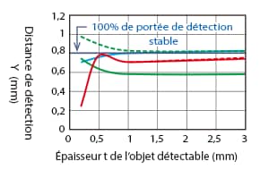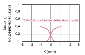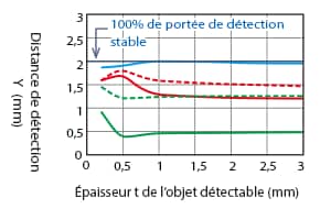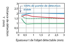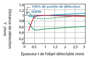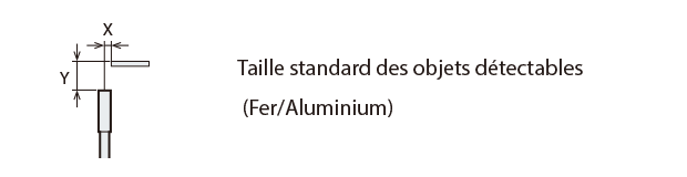 Taille de l’objet détectable : 5 mm × 5 mm, Épaisseur t = 1 mm (taille standard de l’objet détectable), Mode normal