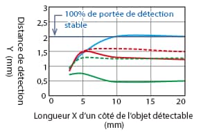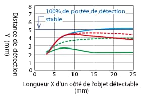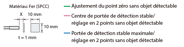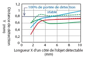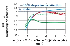Taille de l’objet détectable : 10 mm × 10 mm, Épaisseur t = 1 mm (taille standard de l’objet détectable), Mode normal