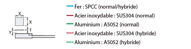 Taille de l’objet détectable : 5 mm × 5 mm, Épaisseur = t mm
