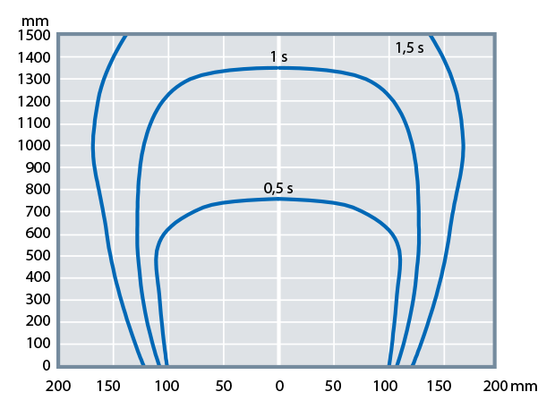 Zone et vitesse d'action antistatique (valeurs moyennes) (Pression appliquée de 0,5 MPa)