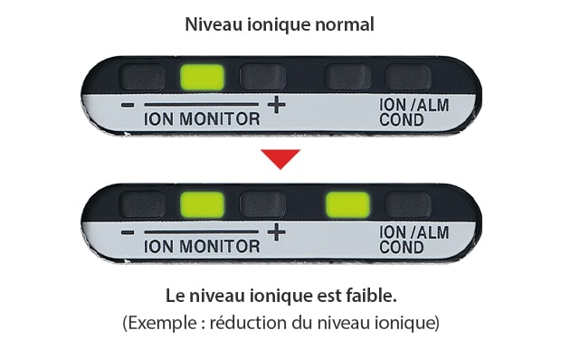 Contrôle la réduction du niveau de génération d’ions due à la poussière ou à l’usure de la pointe de l’électrode.