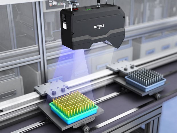 La Série LJ-S8000 permet d'identifier les types d'injecteurs disposés sur la palette. Grâce à un large champ de vision allant jusqu'à 640 × 640 mm, il est possible de différencier facilement des types de produits mélangés en installant simplement le système.