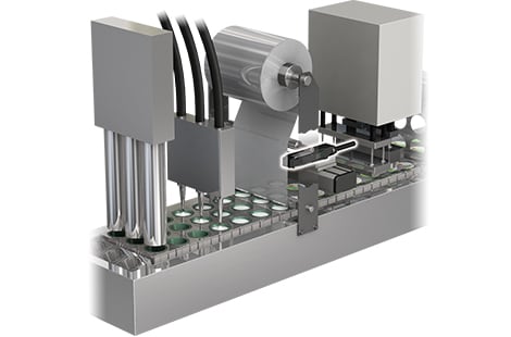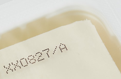 L’imprimante à jet d’encre continu imprime une date sur l’opercule utilisé pour fermer les pots. Déplacés rangée par rangée, les pots sont d’abord remplis, puis un opercule imprimé est thermoscellé sur le dessus. La tête d’impression peut être montée sur un bras traversant afin de permettre son déplacement, pour plus d’efficacité.
