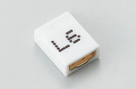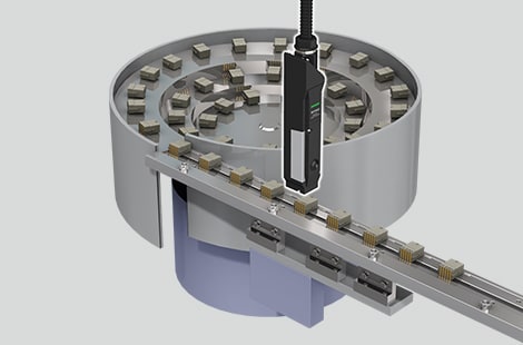 L’imprimante à jet d’encre continu imprime un numéro de produit sur des pièces électroniques, telles que des connecteurs ou interrupteurs, lors de leur séparation par le distributeur de pièces.