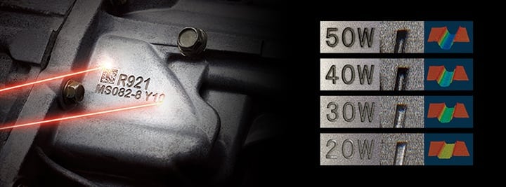 Une forte puissance d’émission permet un temps de marquage plus court et une gravure plus profonde. Les résultats varient également en fonction du matériau à marquer, de sorte que la puissance d’émission optimale diffère d’une application à une autre.