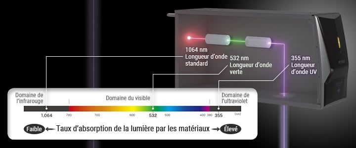 Plus la longueur d’onde de la lumière laser est courte, meilleur est le contraste avec un endommagement moindre. Les résultats varient également en fonction du matériau à marquer, de sorte que la longueur d’onde optimale diffère d’une application à une autre.