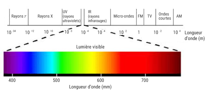 Les ondes électromagnétiques dans le domaine des longueurs d'onde visibles par l'œil humain correspondent à ce que l'on appelle la « lumière visible ». La lumière visible varie de 360-400 nm, du côté des longueurs d'onde courtes, jusqu'à 760-830 nm, du côté des longueurs d'onde longues. Les longueurs d'onde plus courtes ou plus longues que la lumière visible ne sont pas perçues par l'œil humain.