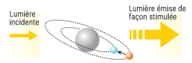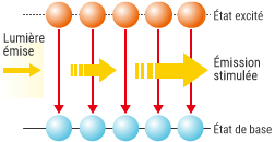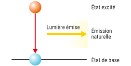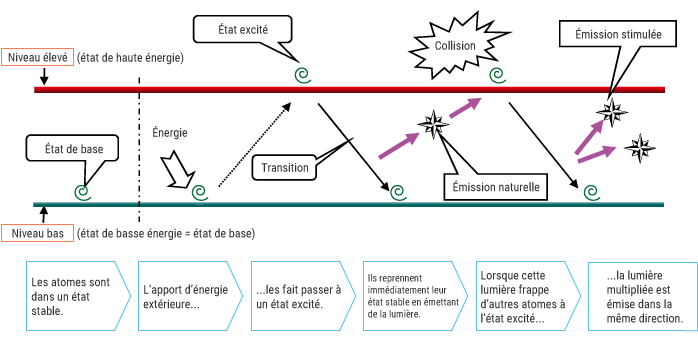Lorsqu'une transition se produit, une lumière correspondant à la différence d'énergie est émise. Ce phénomène est appelé émission naturelle. La lumière émise entre en collision avec d'autres atomes également excités, ce qui induit de nouveau des transitions. La lumière correspondant aux transitions induites est appelée « émission stimulée ».