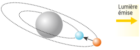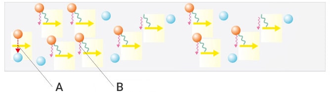 Les électrons des atomes absorbent la lumière fournie par une source extérieure, passant de leur état fondamental (niveau d’énergie bas) à un état excité (niveau d’énergie élevé). Plus le niveau d’énergie augmente, plus les électrons s’éloignent de leur orbite normale. Cette augmentation du niveau d’énergie est appelée « excitation ».