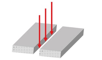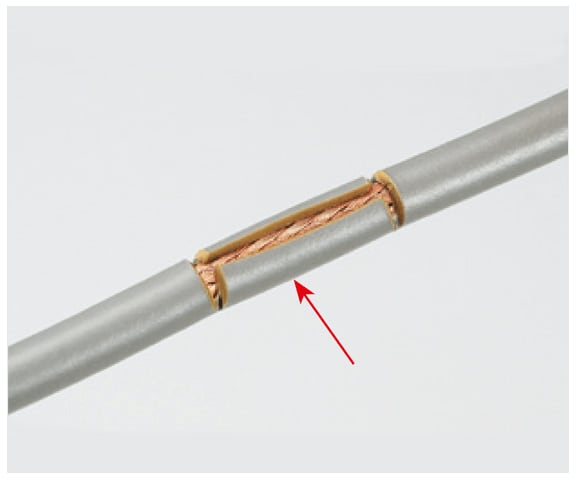 Lors du traitement d’un câble coaxial, le revêtement est découpé au moyen d’un laser CO2, dont la lumière n’est pas absorbée par le métal, tandis que les conducteurs internes et externes à microstructure métallique sont découpés au laser YVO4. Un traitement simultané est ainsi possible en tirant parti des caractéristiques de chaque laser.