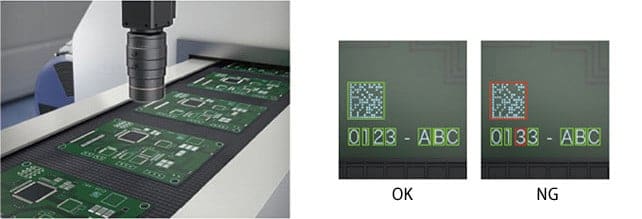 L’OCR est une technologie de reconnaissance des caractères contenus dans une image. Le système de vision capture une image de la cible au moyen d’une caméra, reconnaît les caractères de l’image capturée et compare leur forme aux données enregistrées dans le dictionnaire (polices de caractères) pour les lire en tant que caractères. L’OCR est devenue une technologie standard de l’identification et de l’enregistrement des dates d’expiration ou numéros de pièce. Elle permet, en outre, d’éviter les erreurs inhérentes à la lecture et à la saisie manuelles.