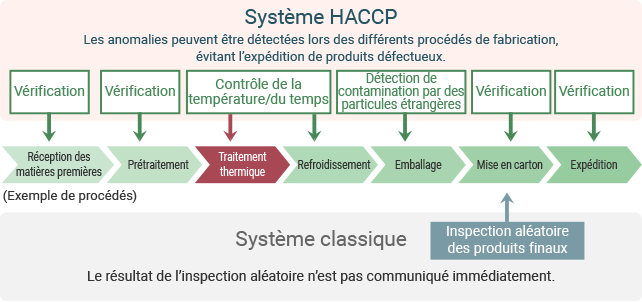 Dans le cadre d’un contrôle d’hygiène classique, les normes applicables aux installations/équipements et aux méthodes de traitement des aliments sont spécifiées puis les produits finaux sont contrôlés. Le système HACCP préconise d’analyser les risques à chaque procédé de fabrication, de réaliser des vérifications intensives lors des procédés importants et d’effectuer un contrôle/une inspection sur la base d’une norme spécifiquement dédiée à chaque procédé. Les contre-mesures prises tout au long de la chaîne permettent de prévenir les empoisonnements alimentaires et contaminations par des particules étrangères avant que ne se produise un problème, renforçant ainsi la sécurité.