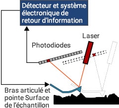 Microscope à balayage par sonde qui mesure et reproduit une cible par déplacement d'une sonde mécanique sur sa surface. Ce système est capable de fournir des données haute résolution à l'échelle subnanométrique.