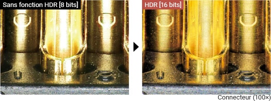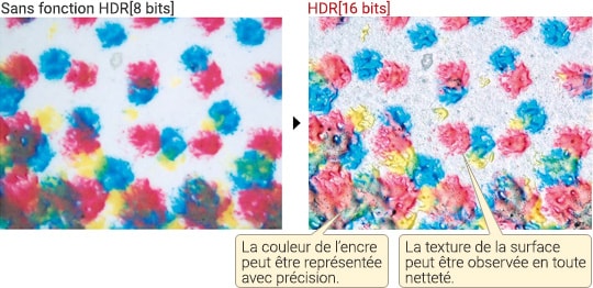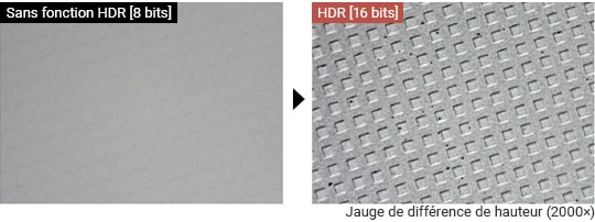 Afin d’obtenir une image 16 bits, la caméra capture plusieurs images sous différentes luminosités en changeant la vitesse d’obturation. Bien que chaque image ait été capturée avec un codage sur 16 bits, seuls 8 bits de données par couleur peuvent être affichés à la fois. L’utilisateur peut spécifier les 8 bits de données à afficher afin de faire ressortir la caractéristique ou le détail souhaité.