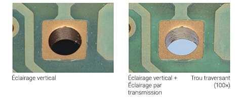 L’éclairage par transmission est essentiellement utilisé pour deux types d’échantillons : les objets transparents ou semi-transparents et les objets opaques mesurés par rétro-éclairage. La lumière est émise en dessous de l’objet et le traverse avant d’être reçue par les yeux de l’observateur ou par la caméra. Cet éclairage est principalement employé dans le cadre d’applications biologiques, pour la capture de cellules ou de tissus sur des lamelles ou autres supports d’échantillons. Il permet également de rétro-éclairer un objet, créant une silhouette bien nette pour mesurer avec précision son profil.