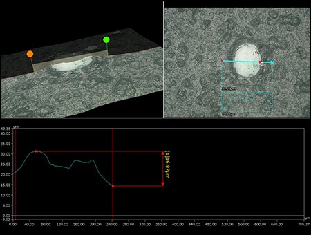 De plus, le mode d'accentuation des ombres, qui exploite l’objectif haute résolution, le capteur CMOS 4K et l’éclairage intégré, permet de superposer les informations de couleur sur l’image de la texture, afin d’afficher simultanément les irrégularités et les nuances de la surface. Il est ainsi possible de mesurer le profil d’une inclusion et d’autres défauts de peinture, pour une analyse quantitative efficace.