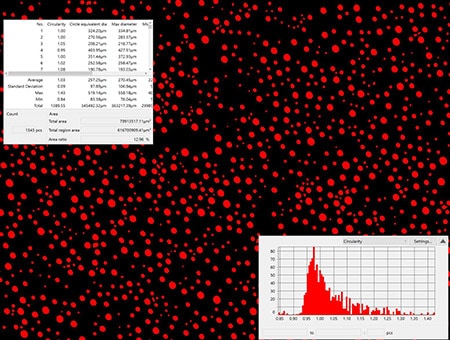 Le microscope numérique 4K est capable d’effectuer un comptage et une mesure de surface des cibles dans la plage spécifiée. Il est également possible d’exclure tout élément cible superflu et de séparer les éléments cibles qui se chevauchent. Enfin, les résultats de mesure peuvent être affichés sous forme d’histogramme.