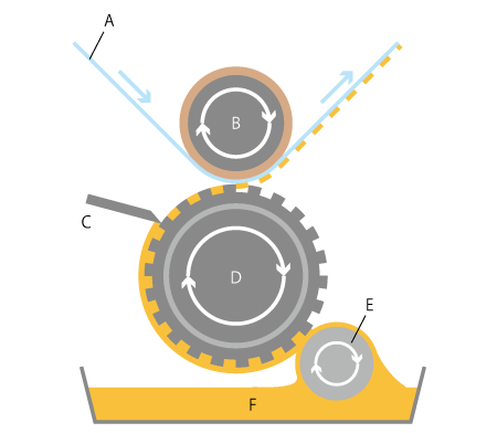 L’encre est appliquée sur la plaque via le rouleau encreur puis la racle permet de retirer l’encre des zones non concernées par l’impression (surfaces qui ne sont pas en creux). L’encre retenue dans les alvéoles est transférée sur le papier situé entre le cylindre de contre-pression (rouleau de contre-pression) et la plaque (cylindre d’héliogravure). Une fois l’encre sèche, le papier d'impression est enroulé.