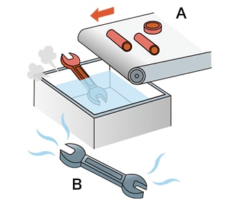 L’association japonaise des techniques de traitement thermique du métal définit le traitement thermique comme suit : procédé consistant à monter le métal en température jusqu’à son rougeoiement, puis à le refroidir. Le traitement thermique est qualifié de technique de métallurgie améliorant les propriétés par montée en température puis refroidissement du métal sans en altérer la forme. Il s’agit d’un procédé de métallurgie, à l’instar de la découpe et de l’élastoformage, qui modifie des propriétés telles que la solidité, la dureté, la ténacité, la résistance aux impacts, la résistance à l’usure, la résistance à la corrosion, les propriétés d’usinage et la malléabilité à froid.