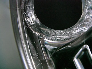 Causes possibles : La fissuration et le craquèlement se produisent sur les produits moulés sous l’effet d’une contrainte interne ou externe.