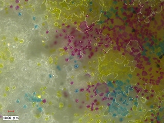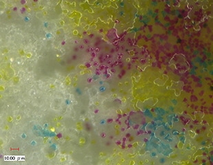 Le microscope numérique 4K Série VHX capture des images haute définition pour observer en détail l’état de surface de l’encre, et ainsi évaluer avec précision ses conditions d'absorption par le papier.
