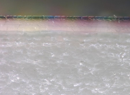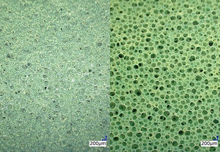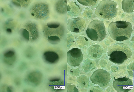Le microscope numérique 4K Série VHX intègre un zoom continu et une fonction de composition en profondeur en direct, qui font automatiquement varier le grossissement jusqu’à un facteur maximal de 6000x. Cette variation automatique du grossissement facilite l’observation détaillée de la texture de surface du rouleau éponge sur des images haute définition et entièrement nettes même sous fort grossissement.