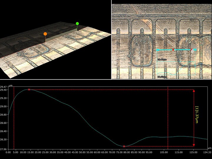 Le microscope numérique 4K Série VHX propose une mesure de forme 3D haute précision à partir d’images haute résolution sous fort grossissement. Outre la cartographie couleur des hauteurs, le nouveau microscope vous permet de réaliser des mesures sur la modélisation 3D de la cible et le profil d’une section définie.