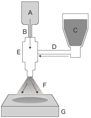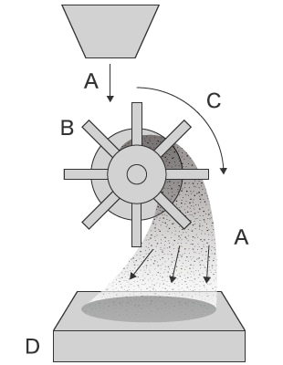 Un moteur fait tourner la turbine, pulvérisant le média par force centrifuge. Aucun compresseur n’est nécessaire, réduisant l’énergie et les coûts requis. Cependant, la force de pulvérisation n’est pas facile à régler, ce qui complique la réalisation d’un traitement de précision.