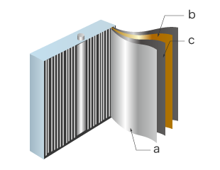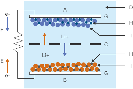 - G) Collecteur de courant : Joue le rôle de conducteur électrique, pour collecter l’électricité générée, ainsi que de matériau support. L’électrode positive est une feuille d’aluminium et l’électrode négative, une feuille de cuivre.