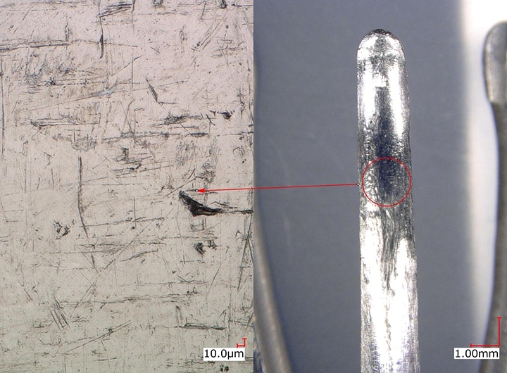 Ces mesures permettent d’examiner quantitativement les cibles afin de déterminer si le défaut est plutôt un corps étranger, une fissure, une dépression ou un trou d’épingle. De l’observation sous grossissement aux mesures 2D/3D, réalisez efficacement toutes vos opérations avec un seul microscope Série VHX.