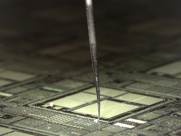 Toutes les microplaquettes de circuit à haut degré d’intégration, fabriquées sur un même wafer, subissent un test électrique par contact simultané avec les multiples pointes de sonde disposées sur le circuit imprimé. Les cartes à pointes détectent les ruptures et courts-circuits et mesurent le courant électrique et les hautes fréquences. Une carte à pointes est généralement reliée au sondeur d’un testeur de wafer. Lors du test, ses pointes sont directement mises en contact, depuis le dessus, avec les microplaquettes du wafer installé sur une platine.