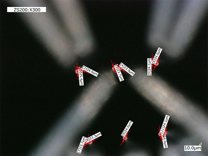 Le diamètre extérieur, caractéristique essentielle pour évaluer l’usure de l’extrémité, est mesuré en temps réel en quelques clics de souris tout en observant l’écran. D’autres caractéristiques, telles que la distance entre deux points, le parallélisme entre deux lignes ou encore l’aire, peuvent être mesurées en suivant la même procédure.