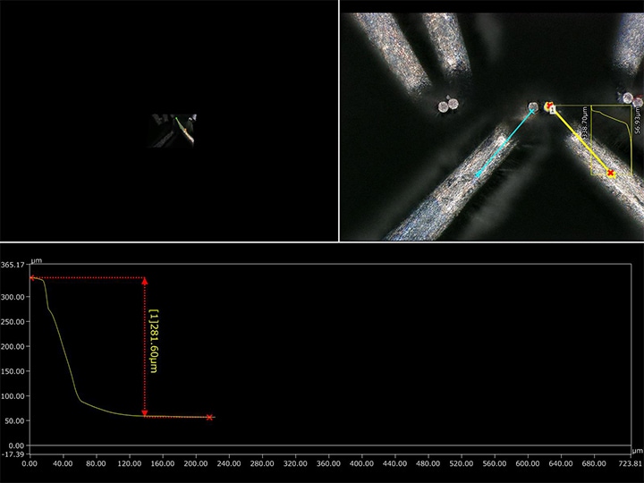 Le profil peut également être mesuré en spécifiant simplement la position visée à l’aide de la souris. Il est ainsi possible d’obtenir le profil et les dimensions en coupe de la zone souhaitée, sans contact et de manière non destructive.