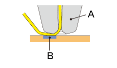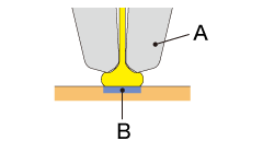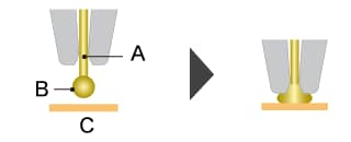 1. Un fil métallique est enfilé dans une buse (semblable à une aiguille à injection). Un courant haute tension est appliqué au niveau de l’extrémité du fil pour lui donner une forme ronde, puis cette partie arrondie est soudée sur l’électrode. Ce procédé est appelé soudure par écrasement de bille ou première soudure. La charge induite par la buse, les ondes ultrasonores et la chaleur émise lors de l’étape de soudure permettent la réalisation effective de la soudure.
