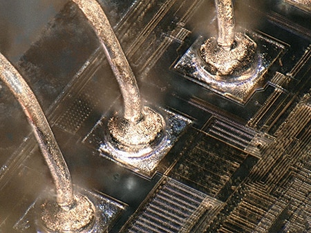Les connexions par fils servent à connecter des électrodes de puce électronique aux conducteurs électriques de grilles de connexion ou de circuits imprimés à l’aide de fins fils en or, en aluminium ou en cuivre.
